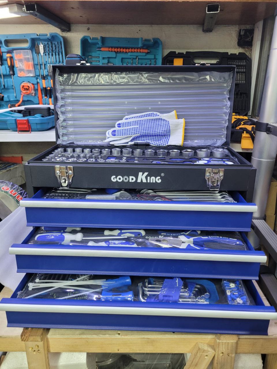 While the exact items can vary by brand, these sets usually contain tools categorized into a sturdy, multi-drawer heavy-duty metal box.