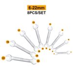 | 8pcs double open end spanner set Size:6-22mm 6x7mm,8x9mm,10x11mm,12x13mm, 14x15mm,16x17mm,18x19mm,20x22mm Fine polished Packed by plastic hanger |