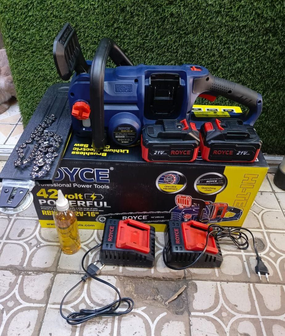 Royce cordless chainsaw, a portable electric tool powered by two 21V batteries.