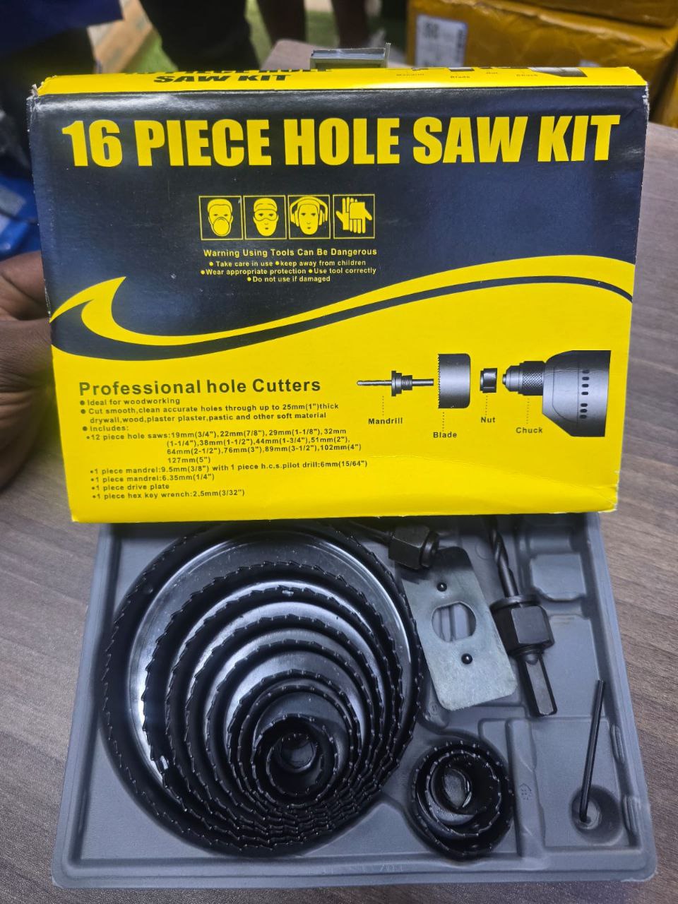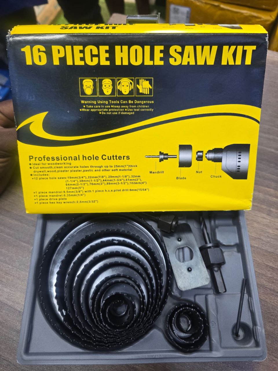 - Various Sizes: The “16 pieces” usually refers to a selection of the most popular hole saw diameters. Common ranges for general-purpose kits are from 19mm (3/4″) up to 127mm (5″). Sizes typically increase in common increments (e.g., 19, 22, 29, 32, 38, 44, 51, 64, 76, 89, 102, 127mm).