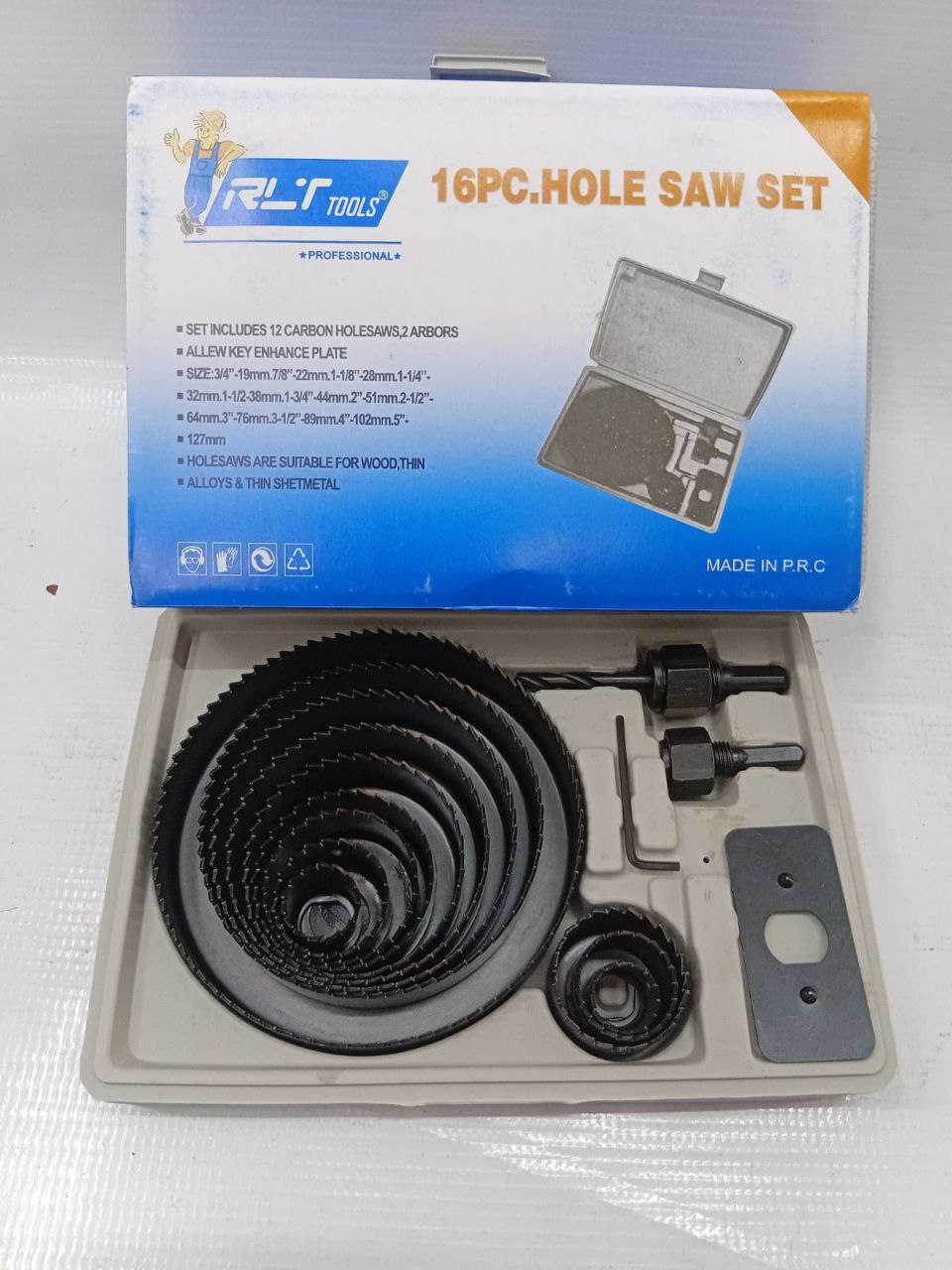 A 16-piece hole saw set is a kit designed to cut circular holes of various diameters in materials like wood, plastic, plasterboard, and sometimes metal, depending on the hole saw material.